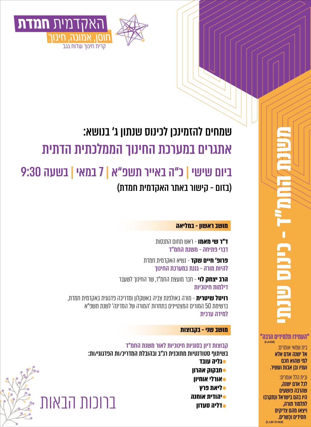 "העמידו תלמידים הרבה" ו בית שמאי אומרים: אל ישנה אדם אלא למי שהוא חכם ועניו ובן אבות ועשיר ובית הלל אומרים: לכל אדם ישנה, שהרבה פושעים היו בהם בישראל ונתקרבו לתלמוד תורה ויצאו מהם צדיקים חסידים וכשרים כבר או האקדמית חמדת קֶרית חינוך שדות נגבשמחים להזמינכן לכינוס שנתון ג' בנושא: אתגרים במערכת החינוך הממלכתית הדתית ביום שישי | כ"ה באייר תשפ"א | 7 במאי | בשעה 9:30 מושב ראשון - במליאה ד"ר שי מאמו - ראש תחום התנסות | דברי פתיחה - משנת החמ"ד פרופ' חיים שקד - נשיא האקדמית חמדת |  להיות מורה - גננת במערכת החינוך הרב יצחק לוי - חבר מועצת החמ"ד, שר החינוך לשעבר | דילמות חינוכיות רויטל שיטרית - מורה באולפנת צביה באשקלון ומדריכה פדגוגית באקדמית חמדת, ברשימת 50 המורים המצטיינים בתחרות 'המורה של המדינה' לשנת תשפ"א | למידה ערכית מושב שני - בקבוצות קבוצות דיון בסוגיות חינוכיות לאור משנת החמ"ד בשיתוף סטודנטיות מתוכנית רג"ב ובהובלת המדריכ/ות הפדגוגי/ות: גליה עובד חנקוק אהרון אורלי אוחיון ליאת פרץ יהודית אוחנה דליה סעדון ברכות הבאות!