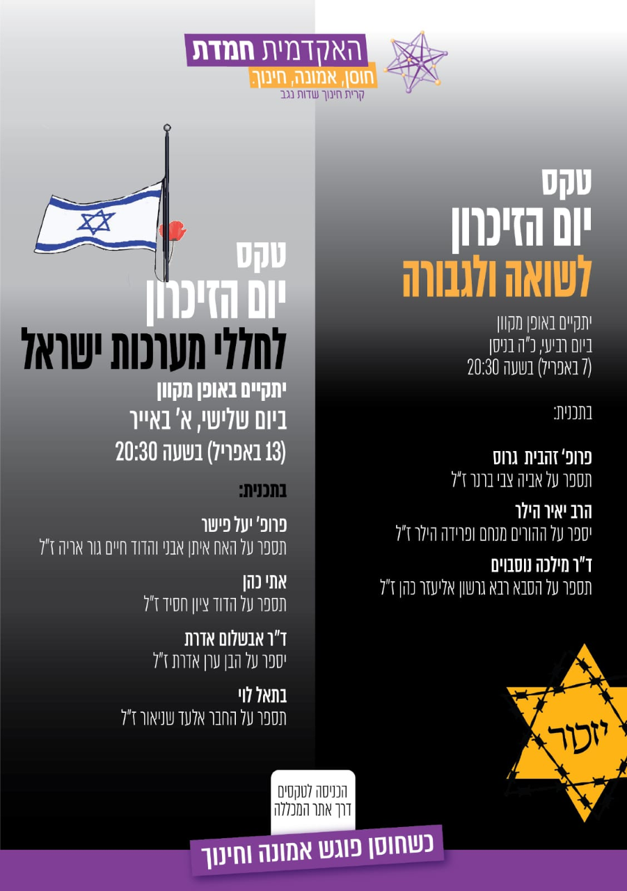 הזמנות לטקסים יום השואה ויום הזיכרון: טקס יום הזיכרון לשואה ולגבורה יתקיים באופן מקוון ביום רביעי כ"ה בניסן 7באפריל בשעה 20:30. בתכנית: פרופ' זהבית גרוס תספר על אביה צבי ברנר ז"ל. הרב יאיר הילר יספר על ההורים מנחם ופרידה הילר ז"ל. ד"ר מילכה נוסבוים תספר על הסבא רבא גרשון אליעזר כהן ז"ל. טקס יום הזיכרון לחללי מערכות ישראל יתקיים באופן מקוון ביום שלישי, א' באייר 13 באפריל בשעה 20:30. בתכנית: פרופ' יעל פישר תספר על האח איתן אבני והדוד חיים גור אריה ז"ל. אתי כהן תספר על הדוד ציון חסיד ז"ל. ד"ר אבשלום אדרת יספר על הבן ערן אדרת ז"ל. בתאל לוי תספר על החבר אלעד שינאור ז"ל. הכניסה לטקסים דקך אתר המכללה. סלוגן- כשחוסן פוגש אמונה וחינוך.