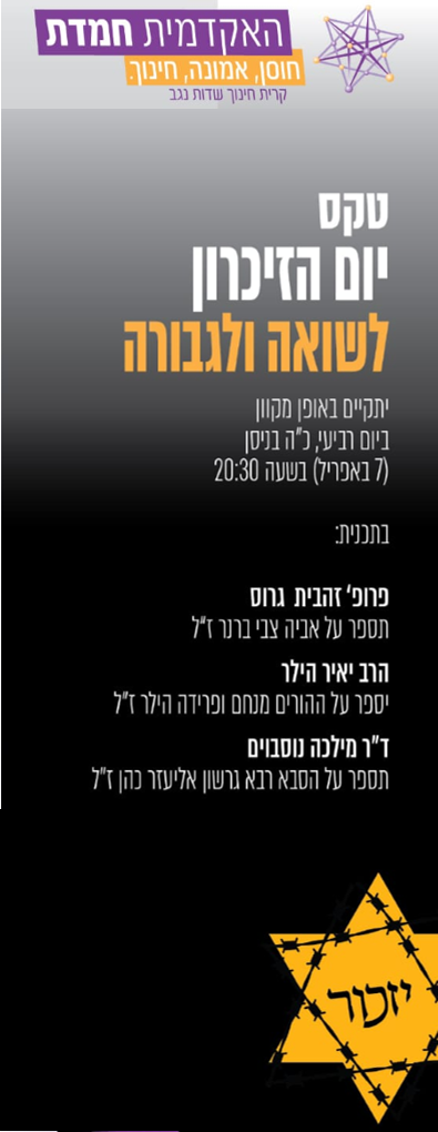 הזמנות לטקסים יום השואה ויום הזיכרון: טקס יום הזיכרון לשואה ולגבורה יתקיים באופן מקוון ביום רביעי כ"ה בניסן 7באפריל בשעה 20:30. בתכנית: פרופ' זהבית גרוס תספר על אביה צבי ברנר ז"ל. הרב יאיר הילר יספר על ההורים מנחם ופרידה הילר ז"ל. ד"ר מילכה נוסבוים תספר על הסבא רבא גרשון אליעזר כהן ז"ל.