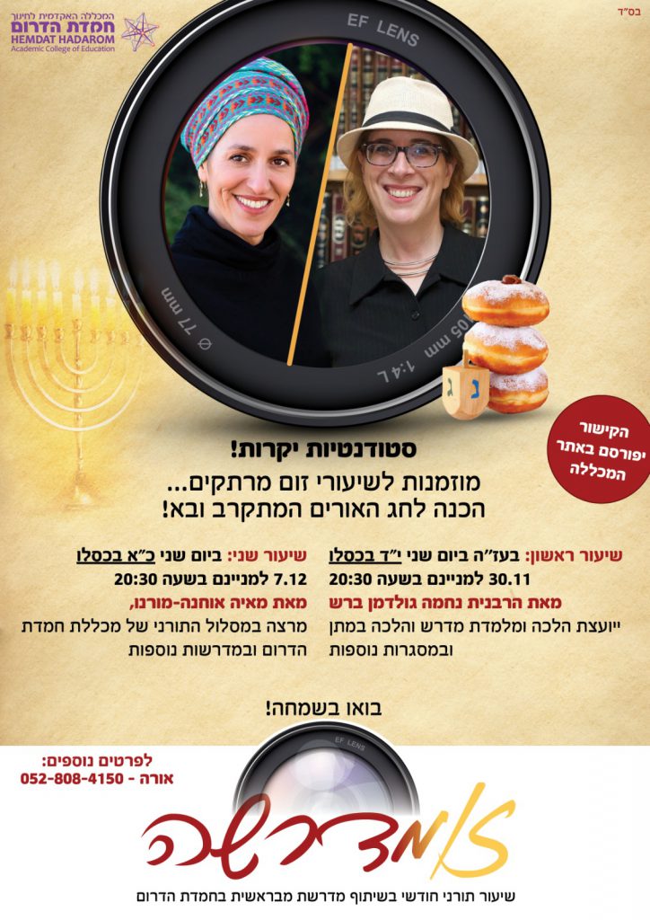 מדרשת מבראשית מזמינה את כלל הסטודנטיות, המרצות והמד"פיות של המכללה לשיעורי זום מרתקים של לימוד תורה לשמה, הכנה לחג האורים המתקרב ובא!
